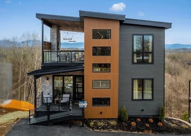 A Brand New Modern Cabin that sleeps 12 people, and features an indoor pool, indoor hot tub, 5 fireplaces, open concept living while offering beautiful views of Mount LeConte.